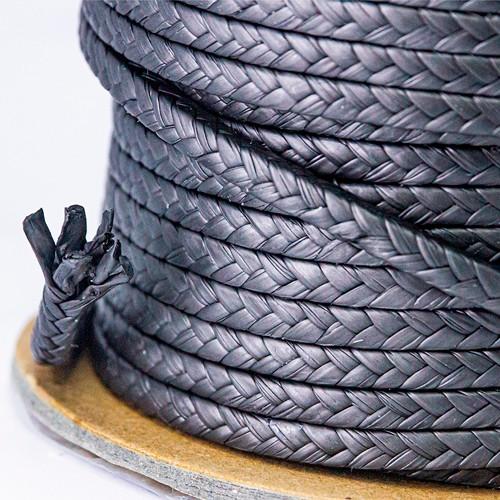 Gaxeta fabricada com filamentos de PTFE expandido com grafite, entrelaçada em seção quadrada e lubrificada com óleo de silicone.
